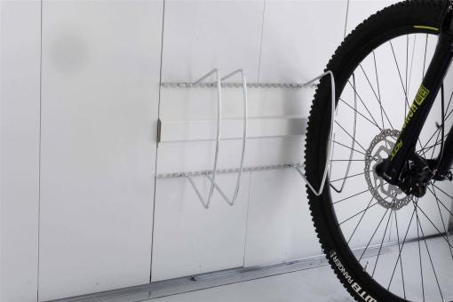 Fahrradständer "bikeHolder" Optimales Abstellen von Fahrrädern durch verstellbare Klemmbügel Grundplatte wird bei Gerätehäusern in 2 Regalsteher eingehängt (nicht im Lieferumfang enthalten). Schnelles und einfaches Fixieren der Fahrradreifen